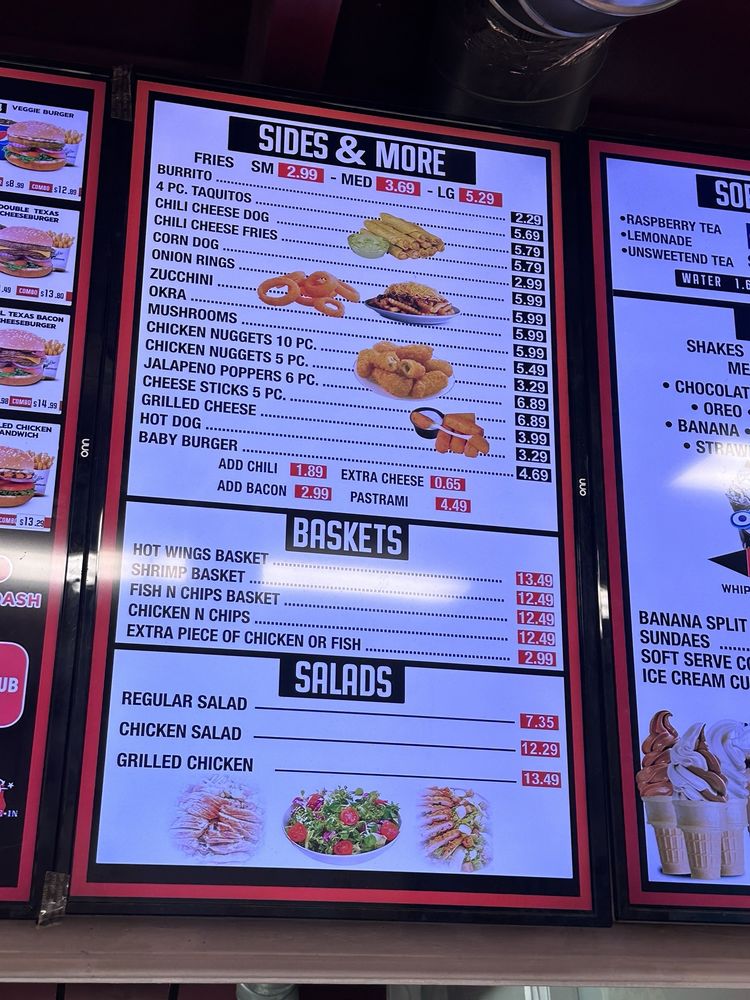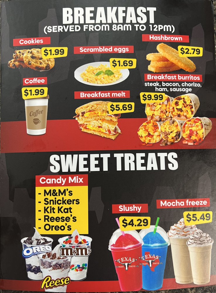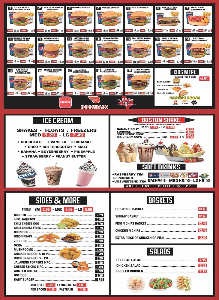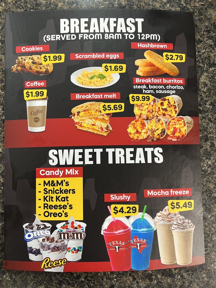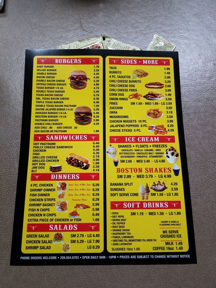 Texas Burger Drive-In, located in Gustine, CA, offers a diverse menu filled with delicious burgers and sandwiches. The restaurant provides a range of options for breakfast, including avocado burgers, baby burgers, and breakfast burritos. All-day offerings feature favorites like avocado cheeseburgers, chicken sandwiches, and chili cheese dogs. With a variety of flavors and options, Texas Burger Drive-In caters to all tastes. The restaurant also offers amenities such as outdoor seating, free Wi-Fi, and drive-thru service, making it a convenient and enjoyable dining experience. Whether you're craving a classic burger or something more unique, Texas Burger Drive-In has something for everyone.